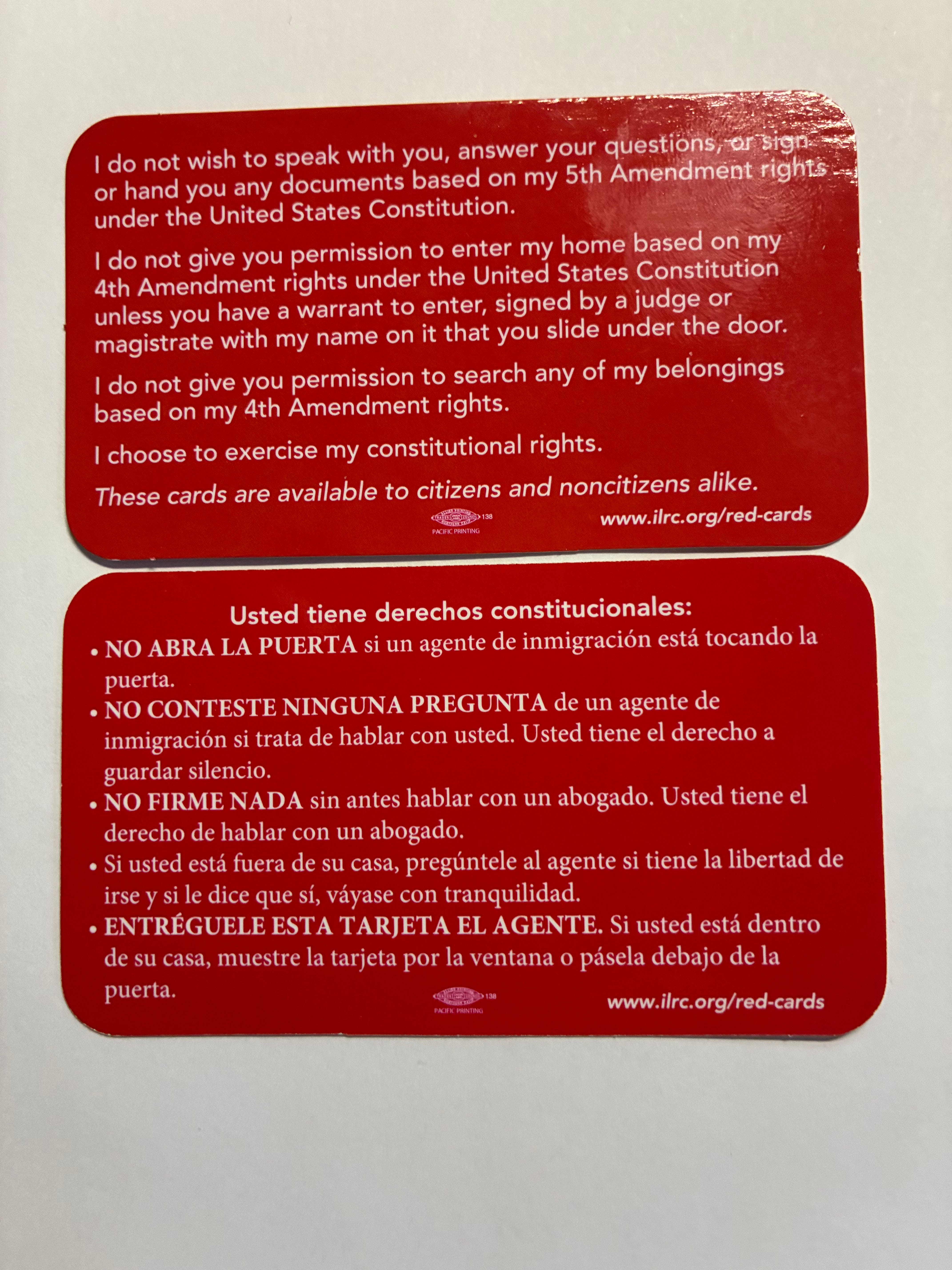 Are you worried about remembering your rights or saying the wrong thing when approached by immigration enforcement officers? Red cards are like helpful business cards that you can hand to an officer if he/she approaches you in public, or slide under your front door or if an officer knocks on your front door and begins to ask questions. Red cards are printed with your rights under the Constitution, and a statement that you are exercising your right to remain silent.